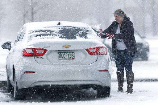 A motorist clears the windows of her vehicle as a late winter storm packing hurricane-force winds and snow sweeps over the intermountain West Wednesday, March 13, 2019, in Denver. (AP Photo/David Zalubowski)