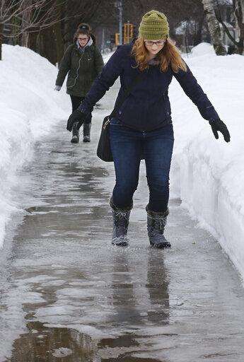 University of Wisconsin-Eau Claire student Kaylee Stuttgen of Fall Creek, WIis. steadies herself through ice and puddles as she walks along Garfield Ave. to school in Eau Claire, on Wednesday, March 13, 2019. (Dan Reiland/The Eau Claire Leader-Telegram via AP)