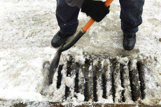 Maintenance supervisor Dan Leach frees storm drains of ice and snow at Episcopal Church Homes in St. Paul, Minn. on Tuesday, March 12, 2019. The rain that began falling Tuesday in the Twin Cities was expected to continue through Thursday, making for soggy, foggy -- and possibly icy -- conditions. A flood watch is in effect for the area Wednesday and Thursday, with temperatures forecast to reach into the 40's, triggering considerable snow melt, according to the National Weather Service. (Scott Takushi/Pioneer Press via AP)