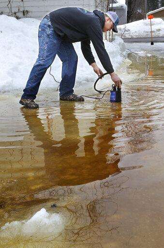 Matt Bue pumps water from his alley to the street in Eau Claire, Wis., on Wednesday, March 13, 2019. The high water was filling his garage along Vine Street. Rain and melting snow have triggered flood warnings in some Upper Midwestern states while blizzard conditions are the primary concern in other states. (Dan Reiland/The Eau Claire Leader-Telegram via AP)