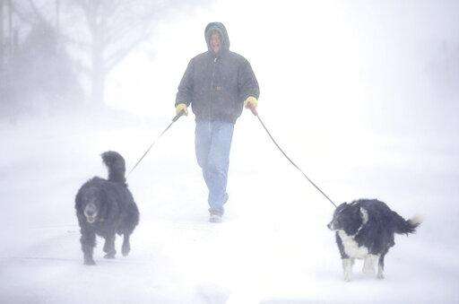 Tom Skaar of Cheyenne laughs while walking his dogs on House Avenue during a blizzard on Wednesday, March 13, 2019, in Cheyenne, Wyo. White-out conditions closed I-80, I-25, and U.S. 85, effectively closing off the state capital from Nebraska, Colorado and the rest of Wyoming. (Jacob Byk/The Wyoming Tribune Eagle via AP)