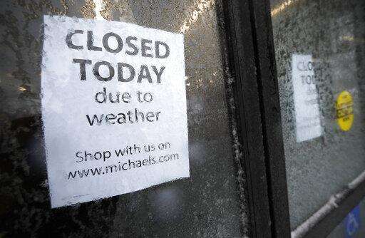 A sign tells shoppers that a craft store is closed as a late winter storm packing hurricane-force winds and snow sweeps over the intermountain West Wednesday, March 13, 2019, in Denver. (AP Photo/David Zalubowski)
