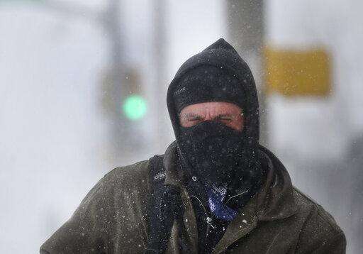 James Little closes his eyes against blowing snow during a blizzard on Wednesday, March 13, 2019, in Cheyenne, Wyo. Heavy snow hit Cheyenne about mid-morning Wednesday and was spreading into Colorado and Nebraska. (Jacob Byk/The Wyoming Tribune Eagle via AP)