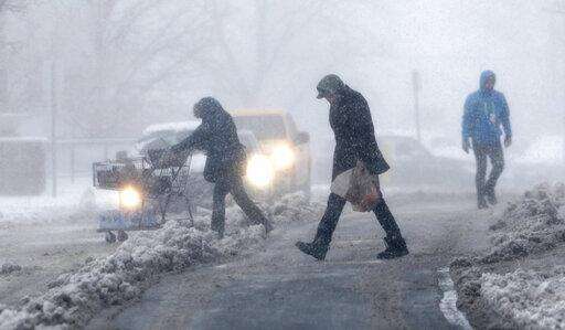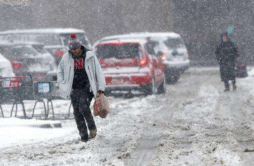Shoppers struggle to head to their vehicles outside a grocery store as a late winter storm packing hurricane-force winds and snow sweeps over the intermountain West Wednesday, March 13, 2019, in Denver. (AP Photo/David Zalubowski)