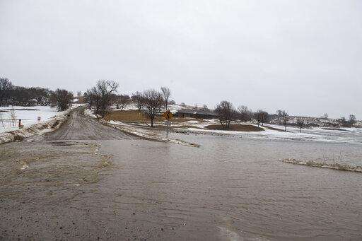 A road starts to flood near Canton, S.D. and the Iowa boarder, Wednesday, March 13, 2019. (Loren Townsley/The Argus Leader via AP)