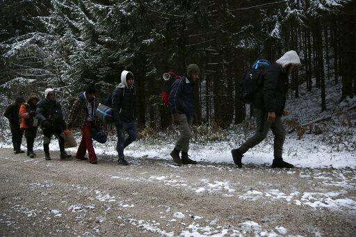FILE - In this Nov. 28, 2018 file photo, a group of migrants moves through a forest in the Pljesevica Mountain in a attempt to illegally cross the border into Croatia. Amnesty International released a report on Wednesday, March 13, 2019, that accuses European Union nations of complacency in the "systematic, unlawful and frequently violent pushbacks" by Croatian border guards of thousands of asylum-seekers to squalid and unsafe refugee camps in Bosnia. (AP Photo/Amel Emric, File)