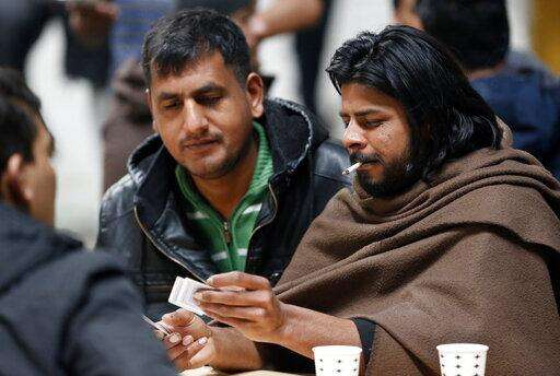 Migrants play cards at a factory hall turned migrants facility in Bihac, Bosnia-Herzegovina, Wednesday, March 13, 2019. A leading rights group has accused European Union states of complacency in the "systematic, unlawful and frequently violent pushbacks" by Croatian border guards of thousands of asylum-seekers to squalid and unsafe refugee camps in Bosnia. (AP Photo/Darko Bandic)