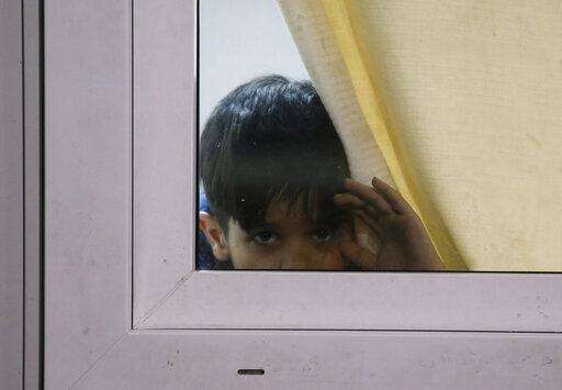 A boy peers through a container window at a factory hall turned migrants facility in Bihac, Bosnia-Herzegovina, Wednesday, March 13, 2019. A leading rights group has accused European Union states of complacency in the "systematic, unlawful and frequently violent pushbacks" by Croatian border guards of thousands of asylum-seekers to squalid and unsafe refugee camps in Bosnia. (AP Photo/Darko Bandic)