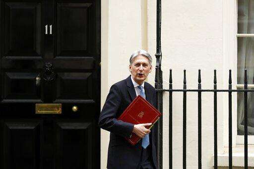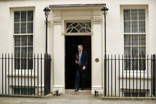 Chancellor of the Exchequer Philip Hammond leaves from Downing Street to go to Parliament to deliver his spring statement in London, Wednesday, March 13, 2019. European Union officials on Wednesday criticized the U.K. Parliament for rejecting a Brexit deal for a second time as the bloc prepared for a chaotic, cliff-edge departure. (AP Photo/Matt Dunham) The Associated Press