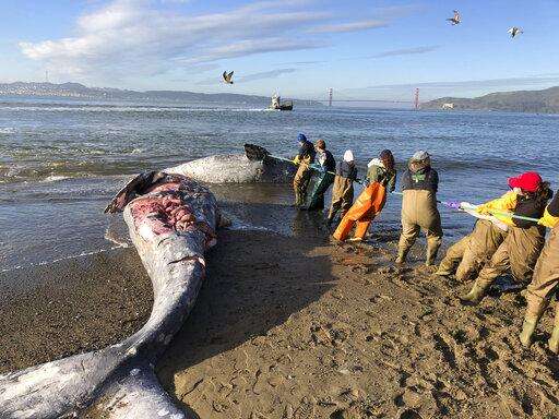 In this photo taken Tuesday, March 12, 2019, provided by The Marine Mammal Center, experts from the center and its partners at the California Academy of Sciences attempt to pull a gray whale carcass from the edge of the surf at Angel Island State Park, Calif. Marine experts say two dead gray whales were found in the San Francisco Bay this week and that one of them died from severe malnutrition. The Marine Mammal Center in Sausalito said Thursday scientists were unable to determine a cause of death for the other whale. (Cara Field/The Marine Mammal Center via AP)
