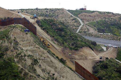 Construction crews replace a section of the primary wall separating San Diego, above right, and Tijuana, Mexico, below left, Monday, March 11, 2019, seen from Tijuana, Mexico. President Donald Trump is reviving his border wall fight, preparing a new budget that will seek $8.6 billion for the U.S-Mexico barrier while imposing steep spending cuts to other domestic programs and setting the stage for another fiscal battle. (AP Photo/Gregory Bull) The Associated Press