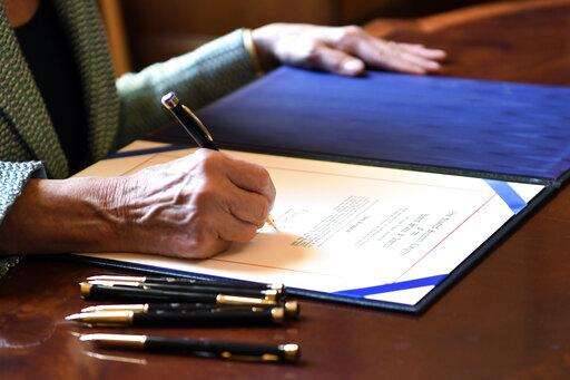 House Speaker Nancy Pelosi of Calif., signs H.J. Res 46, a disapproval resolution that blocks President Trump's National Emergency declaration, on Capitol Hill in Washington, Thursday, March 14, 2019. However, the resolution is expected to be vetoed by President Donald Trump. (AP Photo/Susan Walsh) The Associated Press