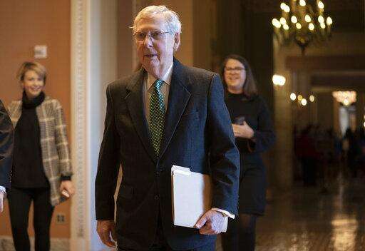 Senate Majority Leader Mitch McConnell, R-Ky., walks to the chamber as the Republican-led Senate is set to deal President Donald Trump a rebuke on his declaration of a national emergency at the Mexican border, with the only remaining question how many GOP senators will join Democrats in defying him, at the Capitol in Washington, Thursday, March 14, 2019. (AP Photo/J. Scott Applewhite) The Associated Press