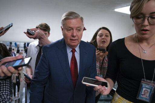 IN this March 13, 2019, photo, reporters pose questions to Sen. Lindsey Graham, R-S.C., at the Capitol in Washington, Wednesday, March 13, 2019. The Republican-led Senate is set to deal President Donald Trump a rebuke on his declaration of a national emergency at the Mexican border, with the only remaining question how many GOP senators will join Democrats in defying him. (AP Photo/J. Scott Applewhite) The Associated Press