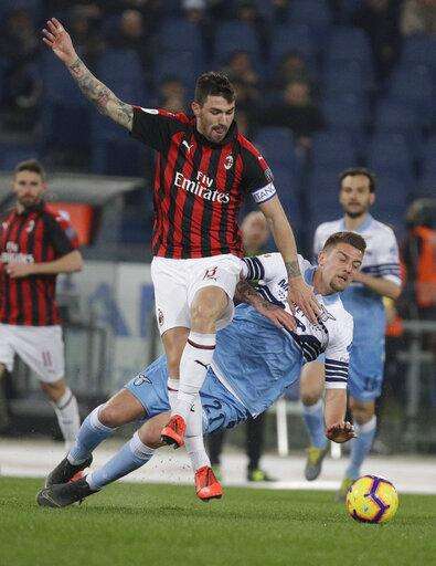 FILE - In this Tuesday, Feb.26, 2019 filer, Lazio's Sergej Milinkovic-Savic, right is tackled by AC Milan's Alessio Romagnoli during the Italian Cup, first leg semifinal soccer match between Lazio and AC Milan at the Olympic stadium in Rome. Just five months after beating AC Milan a derby defeat could leave crisis-hit Inter Milan in danger of missing out on the Champions League. Icardi scored a stoppage-time winner in the October derby but he has not played in more than a month, since being stripped off his captaincy amid protracted contract negotiations. Icardi's downfall and Krzysztof Piatek's arrival at Milan from Genoa means the two sides approach the second derby of the season in very different moods to the first.(AP Photo/Gregorio Borgia) The Associated Press