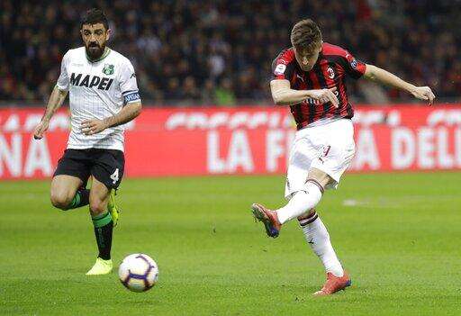 FILE - In this Saturday, March 2, 2019 file photo, AC Milan's Krzysztof Piatek fires a shot past Sassuolo's Francesco Magnanelli during the Serie A soccer match between AC Milan and Sassuolo, at the San Siro stadium in Milan, Italy. Just five months after beating AC Milan a derby defeat could leave crisis-hit Inter Milan in danger of missing out on the Champions League. Icardi scored a stoppage-time winner in the October derby but he has not played in more than a month, since being stripped off his captaincy amid protracted contract negotiations. Icardi's downfall and Krzysztof Piatek's arrival at Milan from Genoa means the two sides approach the second derby of the season in very different moods to the first. (AP Photo/Luca Bruno, File) The Associated Press