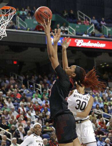 Louisville's Bionca Dunham, left, shoots against Notre Dame's Mikayla Vaughn (30) during the first half of an NCAA college basketball game in the championship of the Atlantic Coast Conference women's tournament in Greensboro, N.C., Sunday, March 10, 2019. (AP Photo/Chuck Burton) The Associated Press