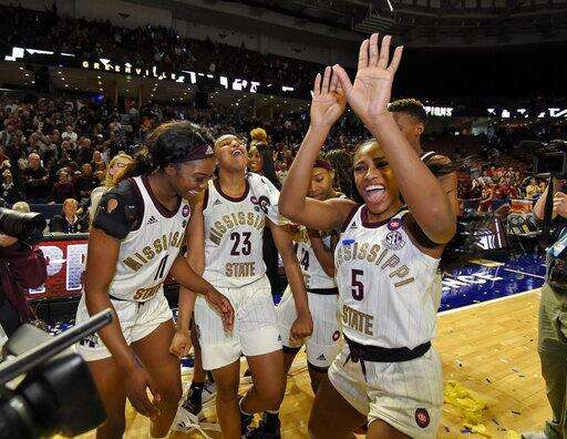 Mississippi State's Anriel Howard (5) along with her teammates celebrate after winning an NCAA college basketball championship game 101-70 against Arkansas in the Southeastern Conference women's tournament, Sunday, March 10, 2019, in Greenville, S.C. (AP Photo/Richard Shiro) The Associated Press