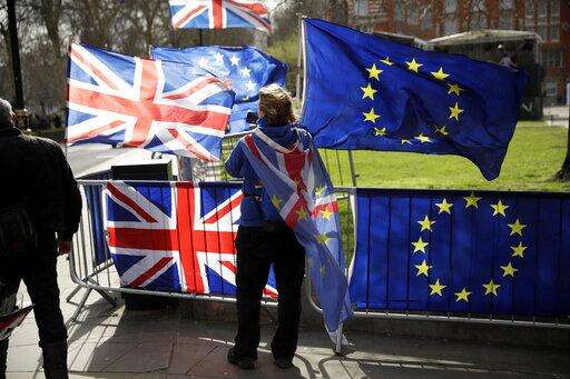 An anti-Brexit supporter stands by European and British Union flags placed opposite the Houses of Parliament in London, Monday, March 18, 2019. British Prime Minister Theresa May was making a last-minute push Monday to win support for her European Union divorce deal, warning opponents that failure to approve it would mean a long - and possibly indefinite - delay to Brexit. Parliament has rejected the agreement twice, but May aims to try a third time this week if she can persuade enough lawmakers to change their minds. (AP Photo/Matt Dunham) The Associated Press