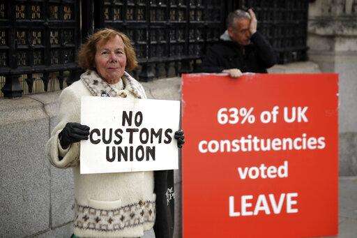 Pro-Brexit supporters protest outside the Houses of Parliament in London, Monday, March 18, 2019. British Prime Minister Theresa May was making a last-minute push Monday to win support for her European Union divorce deal, warning opponents that failure to approve it would mean a long - and possibly indefinite - delay to Brexit. Parliament has rejected the agreement twice, but May aims to try a third time this week if she can persuade enough lawmakers to change their minds. (AP Photo/Matt Dunham) The Associated Press