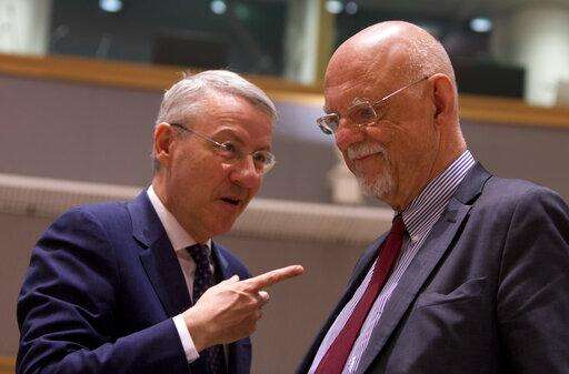 Romania's Minister for European Affairs George Ciamba, left, speaks with Sweden's European Affairs Minister Hans Dahlgren during a meeting of EU ministers for European Affairs at the EU Council building in Brussels, Tuesday, March 19, 2019. Germany's European affairs minister Michael Roth says Brexit is not a game and that the EU is worn out by two years of tortuous and interminable negotiations over Britain's departure from the bloc. (AP Photo/Virginia Mayo) The Associated Press