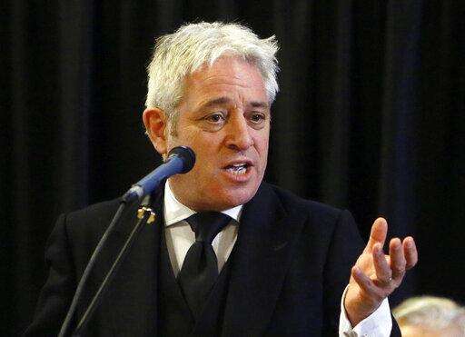 FILE - In this file photo dated Thursday, March 22, 2018, John Bercow, Speaker of the House of Commons speaks at Westminster Hall inside the Palace of Westminster in London. Bercow dealt a potentially fatal blow to Prime Minister Theresa May's ailing Brexit deal on Monday, March 18, 2019, saying the government couldn't keep asking lawmakers to vote on the same Brexit deal that lawmakers have already rejected twice. (AP Photo/Alastair Grant, FILE) The Associated Press