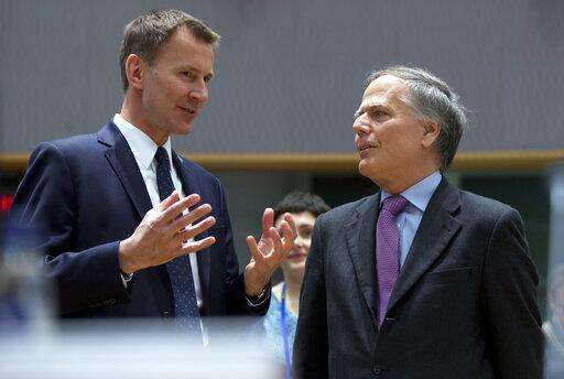 British Foreign Secretary Jeremy Hunt, left, speaks with Italian Foreign Minister Enzo Moavero Milanesi during a meeting of EU foreign ministers at the EU Council building in Brussels, Monday, March 18, 2019. EU foreign ministers hold talks with their Chinese counterpart as the bloc seeks to establish a new strategic balance with the Asian economic giant. (AP Photo/Virginia Mayo) The Associated Press