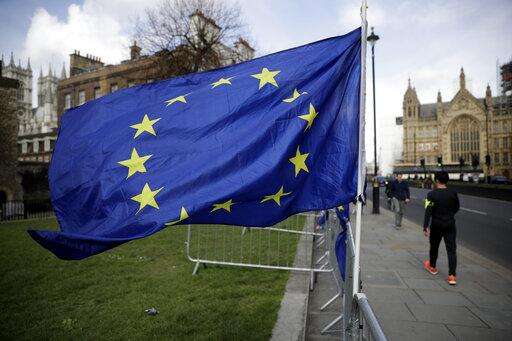 A European flag placed by anti-Brexit remain in the European Union supporters flies backdropped by the Houses of Parliament, at right, in London, Monday, March 18, 2019. British Prime Minister Theresa May was making a last-minute push Monday to win support for her European Union divorce deal, warning opponents that failure to approve it would mean a long - and possibly indefinite - delay to Brexit. Parliament has rejected the agreement twice, but May aims to try a third time this week if she can persuade enough lawmakers to change their minds. (AP Photo/Matt Dunham) The Associated Press