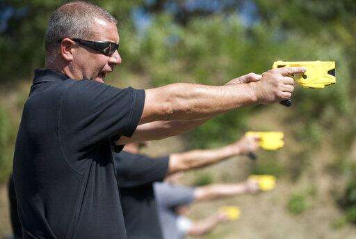FILE- In this Sept. 25, 2012 file photo, Cherry Hill Township Police Officer Patrick Higgins takes part in a taser training session at the Gloucester Township, N.J., Police Training Facility. On Friday, March 22, 2019 a federal judge has ruled that New York's ban on personal ownership of stun guns is unconstitutional. Friday's ruling by a district judge in Utica, N.Y., is the latest in a series of court decisions that have led to the loosening of restrictions on the weapons in several states. (AP Photo/Camden Courier-Post via AP, File) The Associated Press