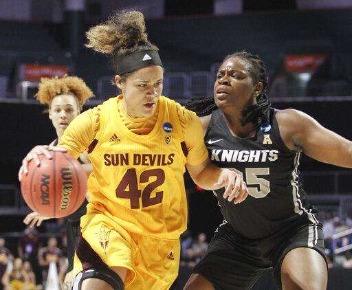 Arizona State forward Kianna Ibis (42) drives the ball as UCF forward Tolulope Omokore (25) defends, during a first round women's college basketball game in the NCAA Tournament in Friday, March 22, 2019, in Coral Gables, Fla. (AP Photo/Luis M. Alvarez) The Associated Press