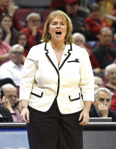 Louisville assistant head coach Stephanie Norman shouts instructions to her team during the second half of a first-round game against Robert Morris in the NCAA women's college basketball tournament in Louisville, Ky., Friday, March 22, 2019. Louisville won 69-34. (AP Photo/Timothy D. Easley) The Associated Press