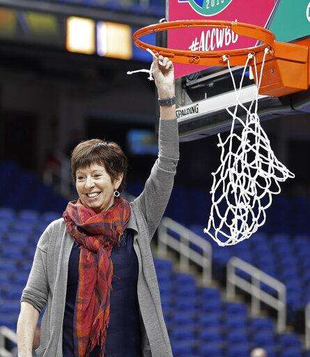 Notre Dame head coach Muffet McGraw holds a piece of the net after her team defeated Louisville in an NCAA college basketball game in the championship of the Atlantic Coast Conference women's tournament in Greensboro, N.C., Sunday, March 10, 2019. (AP Photo/Chuck Burton) The Associated Press