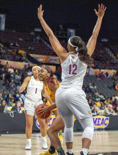 Norfolk State's Kendrea Dawkins, center, is defended by Bethune-Cookman's Chasimmie Brown, right, during an NCAA college basketball game in the championship of the Mid-Eastern Athletic Conference tournament, Saturday, March 16, 2019, in Norfolk, Va. (Mike Caudill/The Virginian-Pilot via AP) The Associated Press