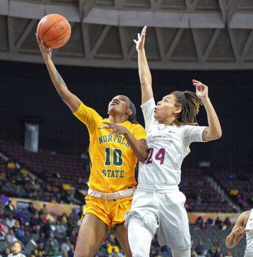 Norfolk State's La'Deja James, left, drives in for a lay-up against Bethune-Cookman's Angel Golden during an NCAA college basketball game in the championship of the Mid-Eastern Athletic Conference tournament, Saturday, March 16, 2019, in Norfolk, Va. (Mike Caudill/The Virginian-Pilot via AP) The Associated Press