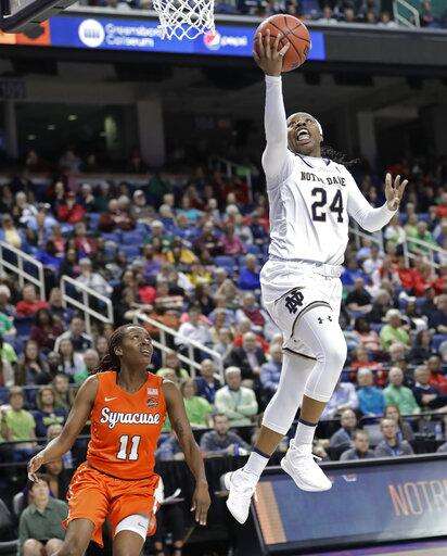FILE- In this March 9, 2019, file photo Notre Dame's Arike Ogunbowale (24) drives to the basket past Syracuse's Gabrielle Cooper (11) during the second half of an NCAA college basketball game in the Atlantic Coast Conference tournament in Greensboro, N.C. The heroine of Notre Dame’s national championship run last year, who won both Final Four and title games with dramatic, last-second shots, is ready for her last ride through the bracket, starting Saturday when the Fighting Irish takes on Bethune-Cookman in the first round. (AP Photo/Chuck Burton, File) The Associated Press