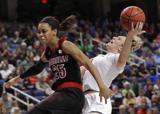 Notre Dame's Marina Mabrey, right, is fouled by Louisville's Asia Durr (25) during the second half of an NCAA college basketball game in the championship of the Atlantic Coast Conference women's tournament in Greensboro, N.C., Sunday, March 10, 2019. (AP Photo/Chuck Burton) The Associated Press