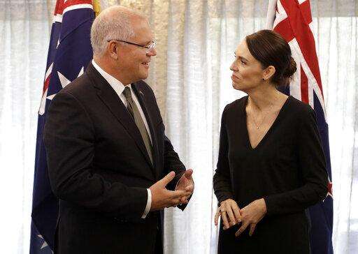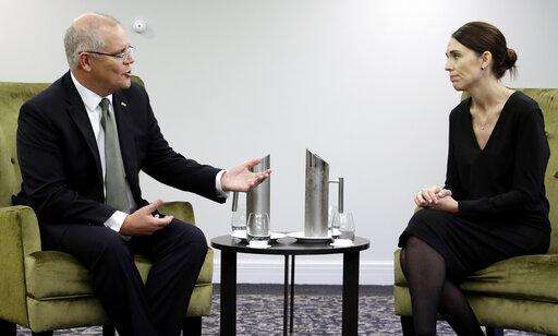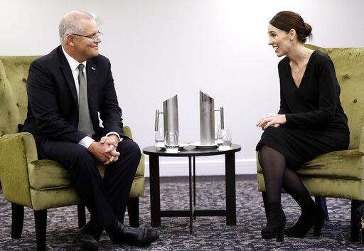 New Zealand Prime Minister Jacinda Ardern, right, talks with Australian Prime Minister Scott Morrison at a bilateral meeting following a national remembrance service for the victims of the March 15 mosques terrorist attack in Christchurch, New Zealand, Friday, March 29, 2019. (AP Photo/Mark Baker, Pool)