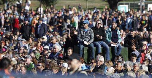 People listen during a National Remembrance Service in Hagley Park for the victims of the March 15 mosques terrorist attack in Christchurch, New Zealand, Friday, March 29, 2019. (AP Photo/Mark Baker)