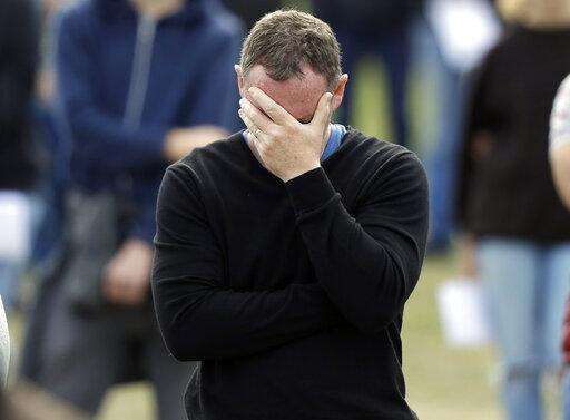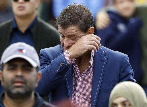 A man reacts during a national remembrance service in Hagley Park for the victims of the March 15 mosque terrorist attack in Christchurch, New Zealand, Friday, March 29, 2019. (AP Photo/Mark Baker)