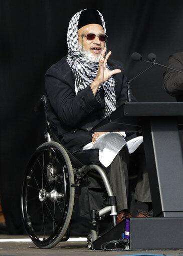 Mosque shooting survivor Farid Ahmed addresses the national remembrance service at Hagley Park for the victims of the March 15 mosques terrorist attack in Christchurch, New Zealand, Friday, March 29, 2019. (AP Photo/Mark Baker)