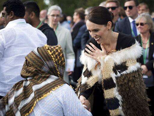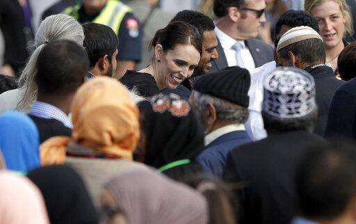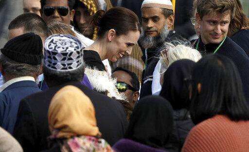 In this photo supplied by the New Zealand government, New Zealand Prime Minister Jacinda Ardern meets members of the Muslim community following the national remembrance service for the victims of the March 15 mosques terrorist attack in Hagley Park, Christchurch, New Zealand, Friday, March 29, 2019. (Mark Tantrum/New Zealand Government via AP)
