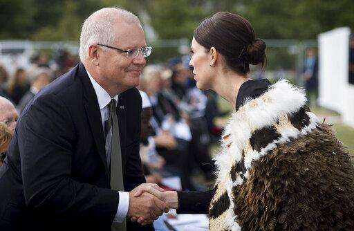 In this photo supplied by the New Zealand government, New Zealand Prime Minister Jacinda Ardern, right, meets Australian Prime Minister Scott Morrison during the national remembrance service for the victims of the March 15 mosques terrorist attack in Hagley Park, Christchurch, New Zealand, Friday, March 29, 2019. (Mark Tantrum/New Zealand Government via AP)