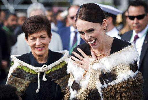 In this image supplied by the New Zealand government, New Zealand Prime Minister Jacinda Ardern, right, reacts as she meets members of the Muslim community following the national remembrance service for the victims of the March 15 mosques terrorist attack at Hagley Park in Christchurch, New Zealand, Friday, March 29, 2019. (Mark Tantrum via AP)