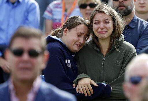 In this Friday, March 29, 2019, file photo, women react as the New Zealand national anthem is sung during a national remembrance service in Hagley Park for the victims of the March 15 mosque terrorist attack in Christchurch, New Zealand. (AP Photo/Mark Baker, File)
