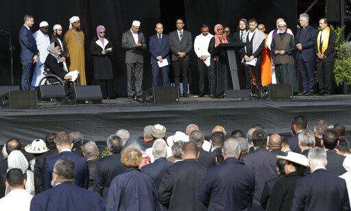 Members of the Christchurch Muslim community read the names of the dead during a national remembrance service for the victims of the March 15 mosques terrorist attack in Christchurch, New Zealand, Friday, March 29, 2019. (AP Photo/Mark Baker)