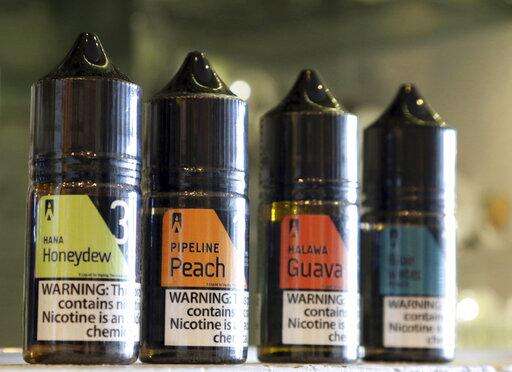 This Wednesday, March 27, 2019 photo shows a selection of e-liquid flavors like Hana Honeydew and Pipeline Peach on a counter at a VOLCANO Fine Electronic Cigarettes store in Aiea, Hawaii. Hawaii lawmakers are considering outlawing flavored tobacco and electronic cigarette liquids like Maui Mango and Cookie Monsta in an effort to stop escalating teenage vaping. (AP Photo/Audrey McAvoy) The Associated Press