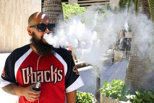 Trevor Husseini exhales a vape cloud in Honolulu on Thursday, March 28, 2019. Hawaii lawmakers are considering outlawing flavored tobacco and electronic cigarette liquids like Maui Mango and Cookie Monsta in an effort to stop escalating teenage vaping. (AP Photo/Audrey McAvoy) The Associated Press
