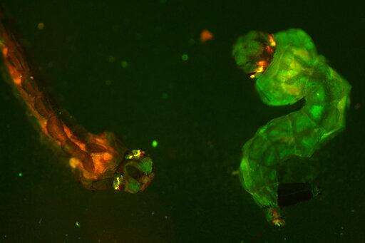 This undated microscope image provided by researcher Ben Matthews of Rockefeller University in February 2019 shows mosquito larvae studied at the Vosshall Laboratory in New York. In November 2018, researchers at the lab published a much-improved description of the DNA code for a particularly dangerous species of mosquito: Aedes aegypti, notorious for spreading Zika, dengue and yellow fever. (Ben Matthews/Rockefeller University via AP) The Associated Press
