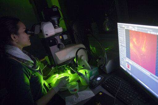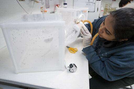In this Tuesday, Feb. 12, 2019 photo, research assistant Anjali Pandey sorts mosquito larvae with edited DNA in the the Vosshall Laboratory at Rockefeller University in New York. Their eyes glowed red or blue under her microscope to indicate they were carrying genetic modifications. (AP Photo/Mary Altaffer) The Associated Press