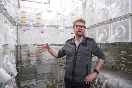 In this Tuesday, Feb. 12, 2019 photo, researcher Ben Matthews speaks in a room housing mosquitos in the Vosshall Laboratory at Rockefeller University in New York. Knowing the DNA sequence lets scientists manipulate it with gene editing techniques, said Matthews, who was part of the international team that published the refined description of the mosquito genome in November 2018. (AP Photo/Mary Altaffer) The Associated Press